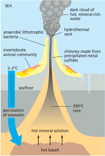 图:《Molecular Biology of the Cell》7E Figure 1–15 海水下渗至地球内部上涌的**热熔火山岩(basalt)**附近,被加热后再向上喷出,同时携带从热岩中浸出的各种矿物质混合物。在喷口周围形成了温度梯度:靠近喷口核心处温度超过 350°C,而周围海水温度仅为 2–3°C。随着水温下降,矿物质从水中沉淀,形成烟囱状结构。不同类别的生物根据不同的温度条件在烟囱的不同区域繁衍生存。典型的烟囱高约几米,喷出富含矿物质的高温水流。图中还显示了依赖矿物质的 lithotrophic 细菌及以它们为食的无脊椎海洋动物的分布位置。