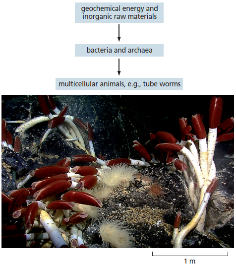图:《Molecular Biology of the Cell》7E Figure 1–16 海底喷口附近 2500 米深处的生物。在喷口附近,温度可达~120°C,各种 lithotrophic 细菌和古菌 直接依靠**地球化学能(geochemical energy)**生存。稍远一些、温度较低的区域,则栖息着以这些微生物为食的各种无脊椎动物。最为显著的是照片中展示的巨型管虫(tube worms,Riftia pachyptila),体长可达 2 米。这些管虫并不直接以 lithotrophic 微生物为食,而是与其共生(symbiosis):管虫体内的专门器官容纳了大量共生硫氧化细菌(sulfur-oxidizing bacteria),这些细菌利用地球化学能为宿主提供营养,而管虫自身没有口、肠或肛门。科学家认为,管虫是由更常规的动物进化而来,并在热液喷口环境下进行了次级适应(secondarily adapted)。(资料来源:Science History Images/Alamy Stock Photo)